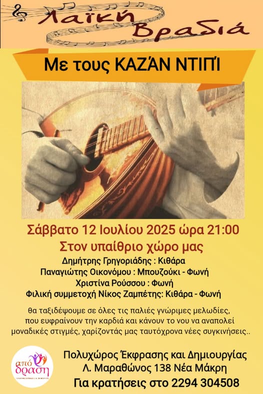 Το Σάββατο το βράδυ, στις 9μμ, ο Πολυχώρος Έκφρασης και Δημιουργίας ΑπόΔΡΑΣΗ στη Νέα Μάκρη, διοργανώνει μια σούπερ καλοκαιρινή βραδιά στον υπαίθριο χώρο της, με τους ‘Καζάν Ντιπί’.