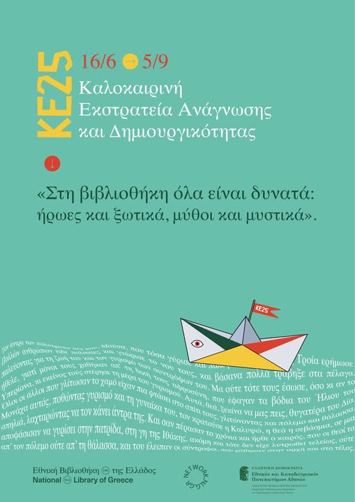 Στην Καλοκαιρινή Εκστρατεία Ανάγνωσης και Δημιουργικότητας 2025, όλες οι βιβλιοθήκες που ανήκουν στο Δίκτυο Ελληνικών Βιβλιοθηκών (ΔΕΒ) ενώνονται με το σύνθημα «Στη βιβλιοθήκη όλα είναι δυνατά: ήρωες και ξωτικά, μύθοι και μυστικά!» και αναδεικνύονται σε χώρους ανακάλυψης, περιπέτειας και δημιουργίας!