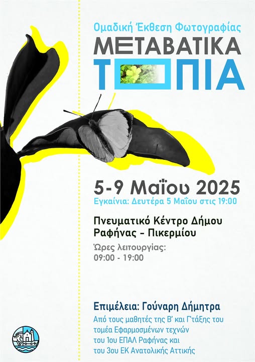Από τη Δευτέρα 5 έως την Παρασκευή 9 Μαΐου, το Πνευματικό Κέντρο Ραφήνας-Πικερμίου παρουσιάζει την ομαδική έκθεση φωτογραφίας ‘Μεταβατικά Τοπία’, με έργα των μαθητών της Β’ και Γ’ τάξης του Τομέα Εφαρμοσμένων Τεχνών του 1ου ΕΠΑΛ Ραφήνας και του 3ου Εργαστηριακού Κέντρου Ανατολικής Αττικής.