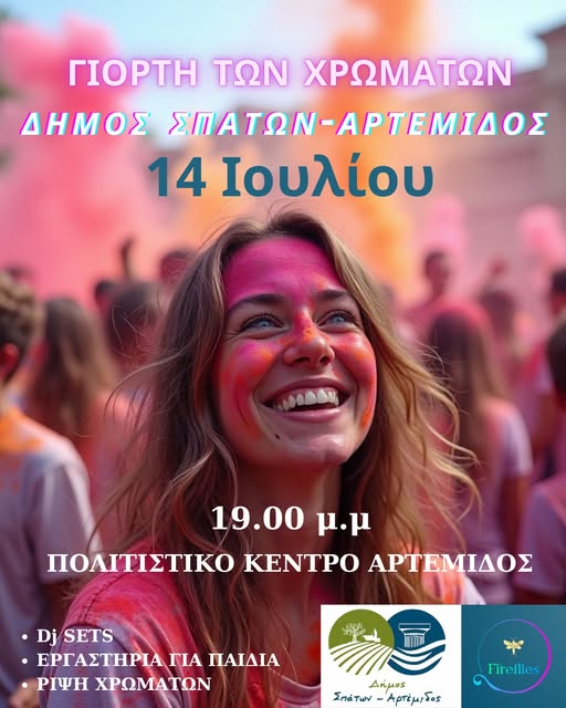 Τη Δευτέρα το απόγευμα, στις 7μμ, η Fireflies Fest και ο Δήμος Σπάτων – Αρτέμιδας, στα πλαίσια των καλοκαιρινών πολιτιστικών του εκδηλώσεων, διοργανώνουν τη Γιορτή των Χρωμάτων.