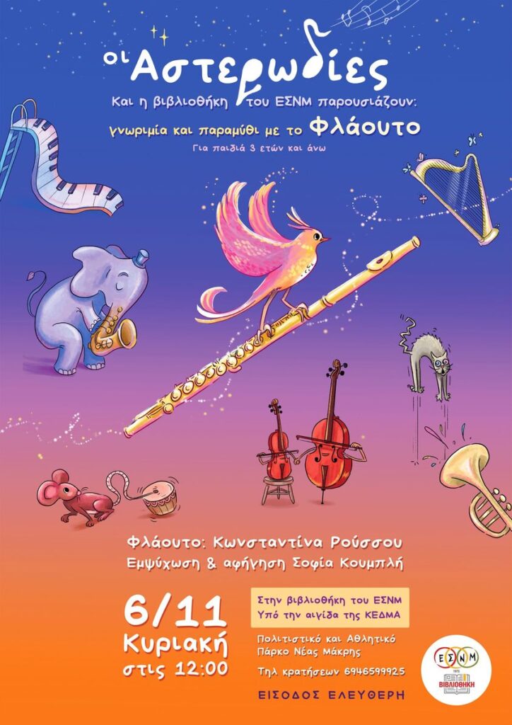 Η αρχή θα γίνει την Κυριακή 06 Νοεμβρίου στις 12μμ με το Φλάουτο και το λαϊκό παραμύθι ‘Το πουλί τ’ αηδόνι’ και στην συνέχεια μία Κυριακή το μήνα, θα φιλοξενείται ένα διαφορετικό μουσικό όργανο ορχήστρας, για να μαθαίνουν τα παιδιά την φύση και κατασκευή του, καθώς και σε ποια οικογένεια οργάνων ανήκει, να εξοικειωθούν με τους ήχους που παράγει, να παίξουν και να καλλιεργήσουν το γόνιμο έδαφος του εσωτερικού τους κόσμου με τους σπόρους της ποιοτικής μουσικής και των παραδοσιακών παραμυθιών!