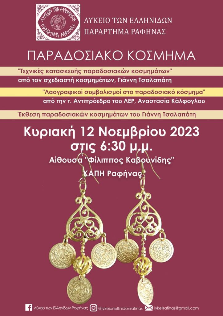 Την Κυριακή στις 6.30μμ το Λύκειο Ελληνίδων Ραφήνας διοργανώνει την εκδήλωση Τεχνικές και Συμβολισμοί στο Παραδοσιακό Κόσμημα.