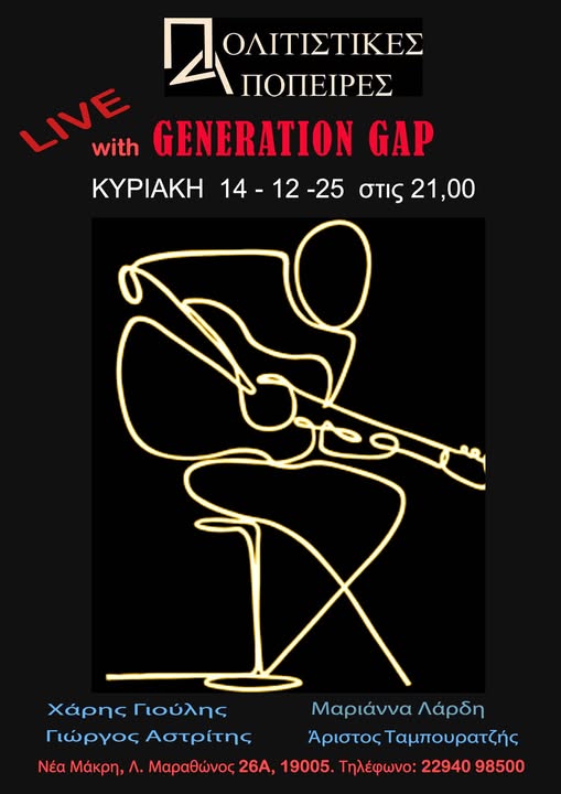 Το γνωστό συγκρότημα Generation Gap αποτελούμενο από τους μουσικούς Πλάτων Ανδριτσάκη στην κιθάρα, Χάρη Γιούλη στο τραγούδι και την ηλεκτρική κιθάρα, Γιώργο Αστρίτη στο τραγούδι και τα πλήκτρα, Άριστο Ταμπουρατζή στα τύμπανα και την Μαριάνα Λάρδη στο τραγούδι θα μας ταξιδέψει με το δικό του ξεχωριστό τρόπο σε Blues Rrock ρυθμούς δημιουργώντας μία δυναμική και άκρως ξεσηκωτική βραδιά.