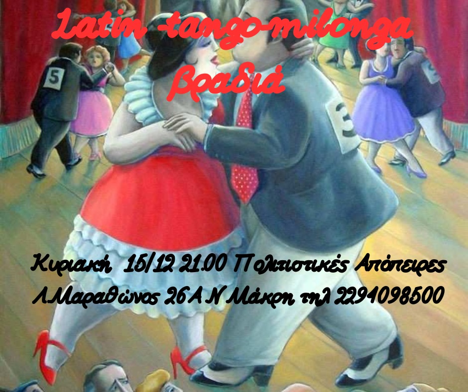 Μια βραδιά αφιερωμένη στο χορό και τη λάτιν μουσική, ένα ταξίδι στην Αργεντινή του TANGO και της MILONGA στους ρυθμούς LATIN. Ένα απόλυτα χορευτικό πάρτι σε ρυθμούς TANGO, MILONGA, KIZOMBA, RUMBA,CHA-CHA, BACHATA, SALSA, αλλά και σε γεύσεις, Cuba Libre, γουακαμόλε, νάτσος και τορτγίγια!