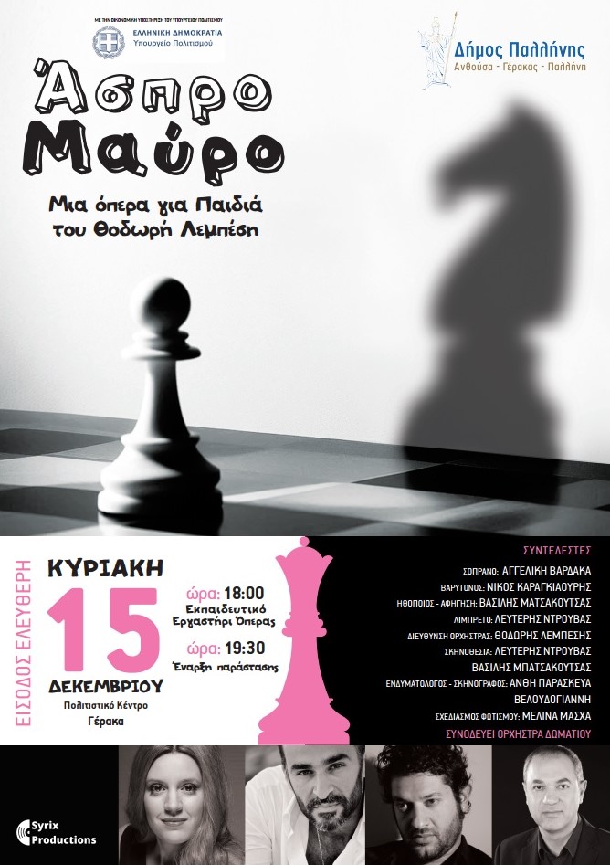 Ο Δήμος Παλλήνης και το Τμήμα Πολιτισμού του Δήμου, την Κυριακή το απόγευμα, στις 7.30μμ, θα φιλοξενήσει την σύγχρονη Παιδική Όπερα ‘Άσπρο – Μαύρο’.