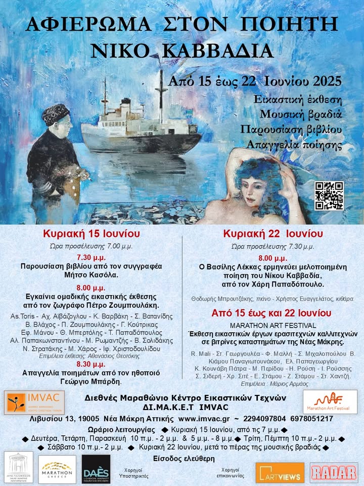 Με αφορμή την επετειακή συμπλήρωση των 50 χρόνων από τον θάνατο του Έλληνα ποιητή, Νίκου Καββαδία, το Διεθνές Μαραθώνιο Κέντρο Εικαστικών Τεχνών ΔΙ.ΜΑ.ΚΕ.Τ. και το MARATHON ART FESTIVAL με την υποστήριξη του συλλόγου Α.Π.Σ. ΤΕΛΜΗΣΣΟΣ ΝΕΑΣ ΜΑΚΡΗΣ ΜΑΡΑΘΩΝΟΣ, παρουσιάζουν ένα αφιέρωμα στην ποίηση του Νίκου Καββαδία, συνδυάζοντας, με μοναδικό τρόπο, ποίηση, εικαστικές τέχνες, μουσική και τραγούδι, με σκοπό να απεικονίσει την πολυπολιτισμική κληρονομιά και το πνεύμα του ποιητή μας.