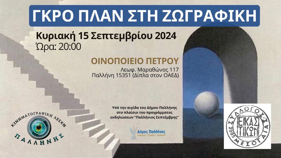 Την Κυριακή το βράδυ, στις 8μμ, η Κινηματογραφική Λέσχη Παλλήνης, σε συνεργασία με το Σύλλογο Εικαστικών Μεσογαίας, παρουσιάζει την εκδήλωση “Γκρο πλαν στη Ζωγραφική”.