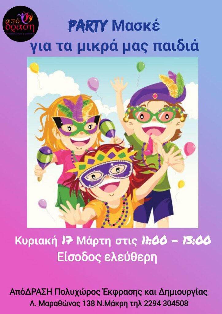 Την Κυριακή το πρωί στις 11πμ ο Πολυχώρος Έκφρασης και Δημιουργίας Απόδραση διοργανώνει ένα διασκεδαστικό Παιδικό Maske Party!