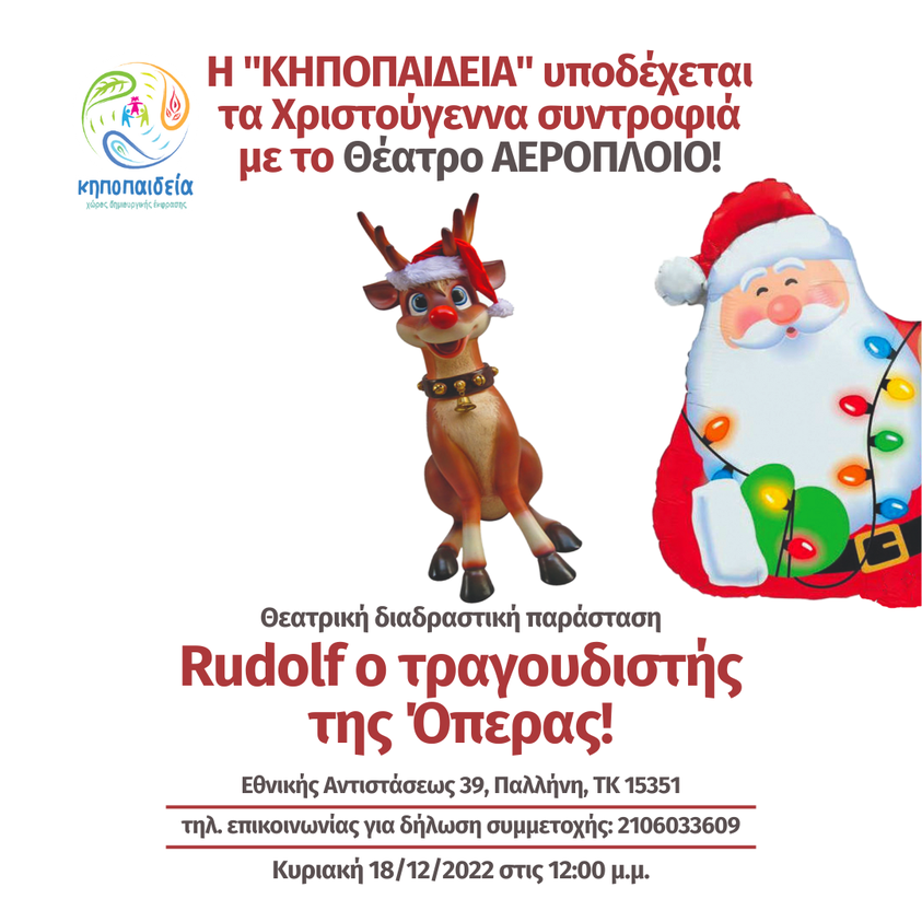 O Χώρος Δημιουργικής Έκφρασης Κηποπαιδεία σας προσκαλεί την Κυριακή στις 12μμ στην θεατρική διαδραστική παράσταση ‘Rudolf ο τραγουδιστής της όπερας’, από την θεατρική ομάδα Αερόπλοιο, που εδώ και 30 χρόνια δημιουργεί παραστάσεις ειδικά για παιδιά.