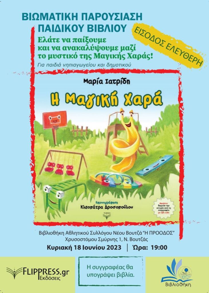 Την Κυριακή στις 7μμ ο κήπος της Βιβλιοθήκης Νέου Βουτζά φιλοξενεί μια ιδιαίτερα φροντισμένη διαδραστική παρουσίαση του παιδικού βιβλίου ‘Η Μαγική Χαρά’ της Μαρίας Ιατρίδη.
