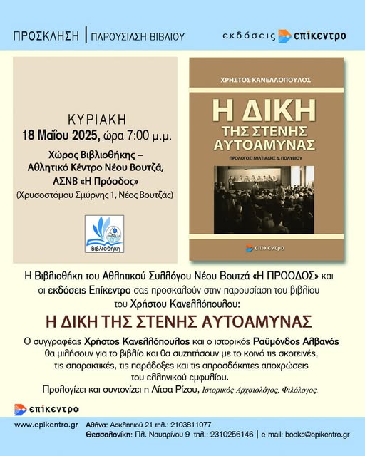 Την Κυριακή το απόγευμα, στις 7μμ, η Βιβλιοθήκη Νέου Βουτζά, διοργανώνει παρουσίαση του βιβλίου ‘Η Δίκη της Στενής Αυτοάμυνας’ του Χρήστου Κανελλόπουλου.