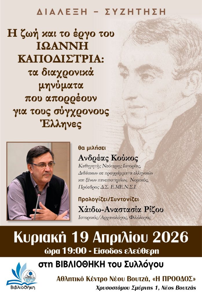 Μια ξεχωριστή διάλεξη/συζήτηση, αφιερωμένη στη ζωή και το έργο του Ιωάννη Καποδίστρια, με ομιλητή τον Δρ. Ανδρέα Κούκο, Καθηγητή Νεότερης Ιστορίας, γνωστό για την εξειδίκευσή του στην καποδιστριακή περίοδο.