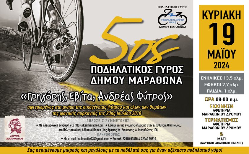 Ο 5ος Ποδηλατικός Γύρος είναι αφιερωμένος στη μνήμη των θυμάτων της φονικής πυρκαγιάς της 23ης Ιουλίου και φέρει την ονομασία Ποδηλατικός Γύρος Δήμου Μαραθώνα ‘Γρηγόρης, Εβίτα, Ανδρέας Φύτρος’.
