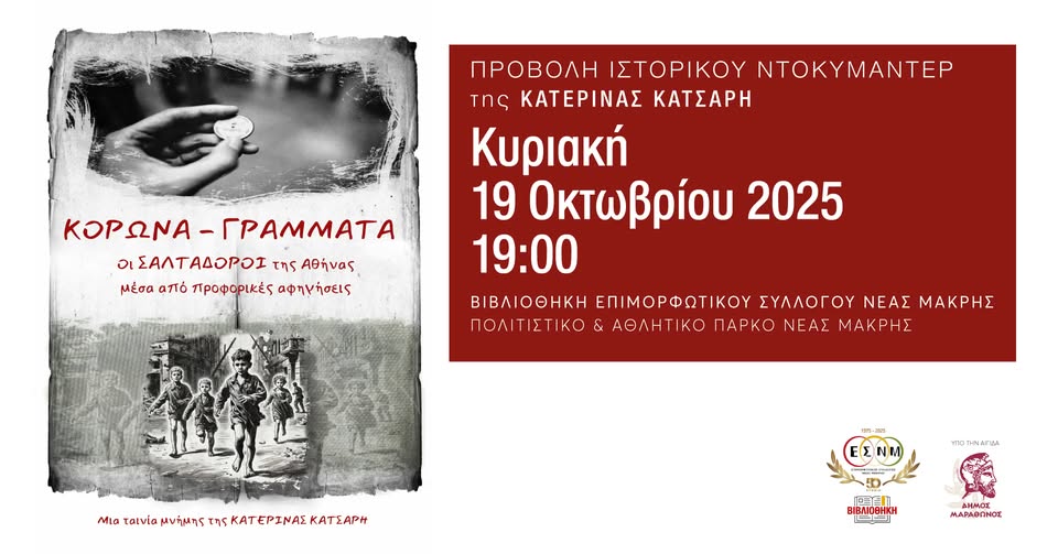 Την Κυριακή το απόγευμα, στις 7μμ, η Ομάδα της Βιβλιοθήκης του Επιμορφωτικού Συλλόγου Νέας Μάκρης, μία εβδομάδα πριν την επέτειο της 28ης Οκτωβρίου και έχοντας την επιθυμία να φέρει πάλι στη μνήμη μας τους ήρωες της κατοχής, διοργανώνει την προβολή του ιστορικού ντοκυμαντέρ της Κατερίνας Κατσάρη ‘Κορώνα-Γράμματα: Οι σαλταδόροι της Αθήνας’, στο χώρο της Δανειστικής Βιβλιοθήκης του Ε.Σ.Ν.Μ.
