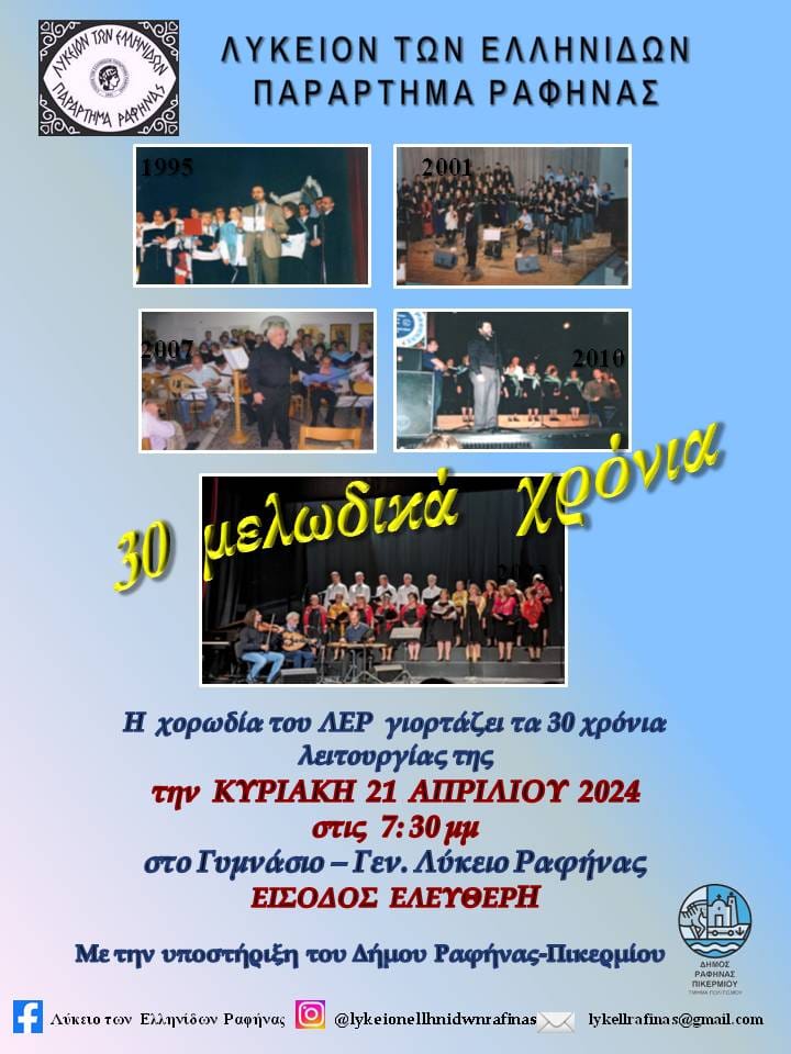 Την Κυριακή στις 7.30μμ το Λύκειο των Ελληνίδων Ραφήνας διοργανώνει τη συναυλία 30 Χρόνια Μελωδίας της χορωδίας του ΛΕΡ, στην αίθουσα εκδηλώσεων του Γυμνασίου – Λυκείου Ραφήνας.