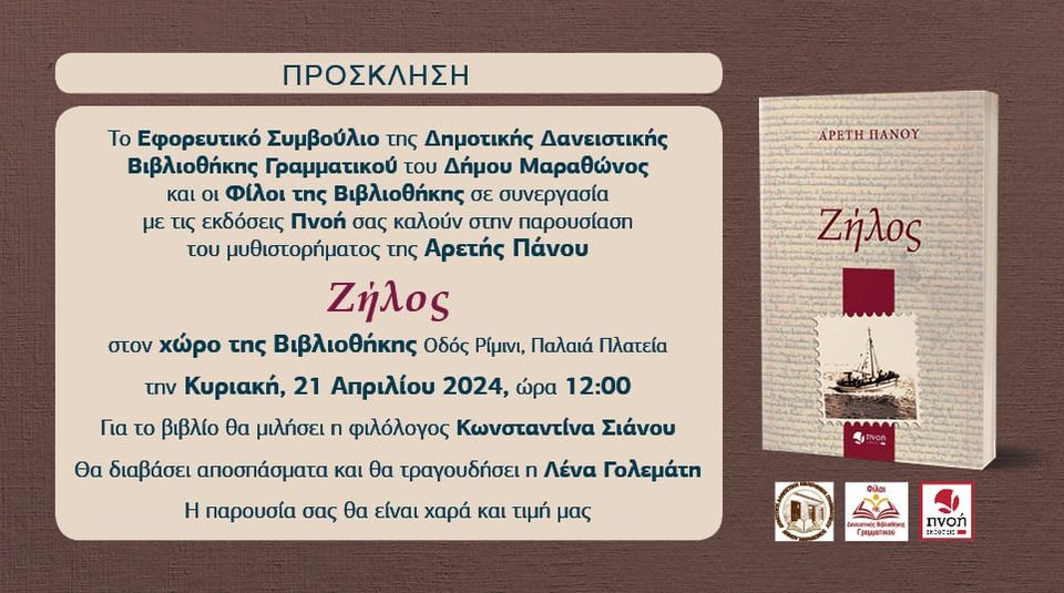 Την Κυριακή το μεσημέρι στις 12μμ η Δημοτική Δανειστική Βιβλιοθήκη Γραμματικού φιλοξενεί την Παρουσίαση του Βιβλίου “Ζήλος” της Αρετής Πάνου.