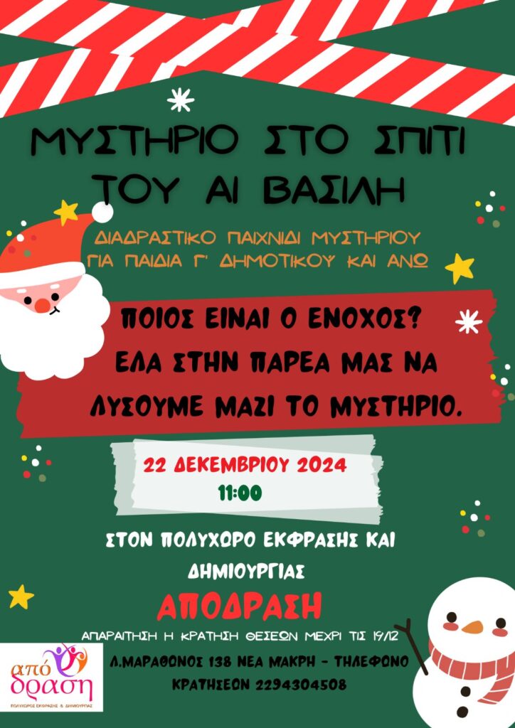 Την Κυριακή το πρωί, στις 11πμ, μην χάσετε την ευκαιρία να λύσετε το γρίφο συμμετέχοντας στο διαδραστικό παιχνίδι μυστηρίου ‘Το μυστήριο σπίτι του Άι Βασίλη’ που απευθύνεται σε παιδιά από γ’ δημοτικού και πάνω.