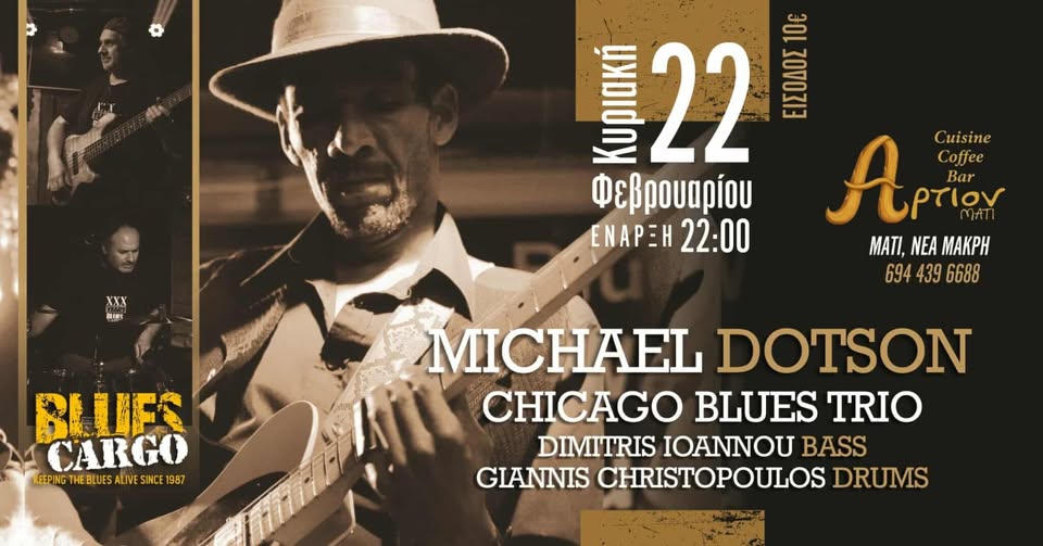 Ο παγκοσμίου φήμης bluesman, κιθαρίστας, συνθέτης και τραγουδιστής από το Σικάγο Michael Dotson σε μια live βραδιά με την καυτή κιθάρα του και διάθεση που θα σας ξεσηκώσει, πλαισιωμένος από τους μουσικούς Δημήτρη Ιωάννου και Γιάννη Χριστόπουλο.