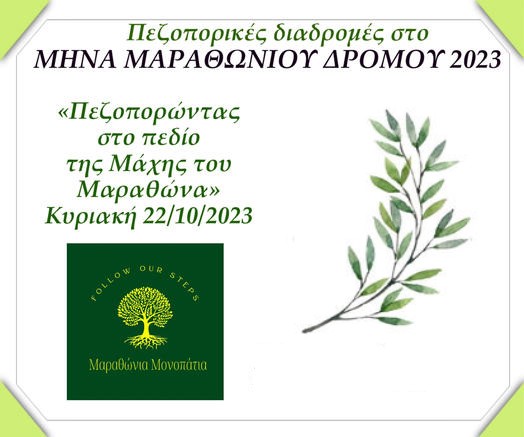 Την Κυριακή στις 10.30πμ τα Μαραθώνια Μονοπάτια διοργανώνουν, στο πλαίσιο των εκδηλώσεων ‘ΜΗΝΑΣ ΜΑΡΑΘΩΝΙΟΥ ΔΡΟΜΟΥ 2023’, την πεζοπορική διαδρομή “Πεζοπορώντας στο πεδίο της Μάχης του Μαραθώνα”.