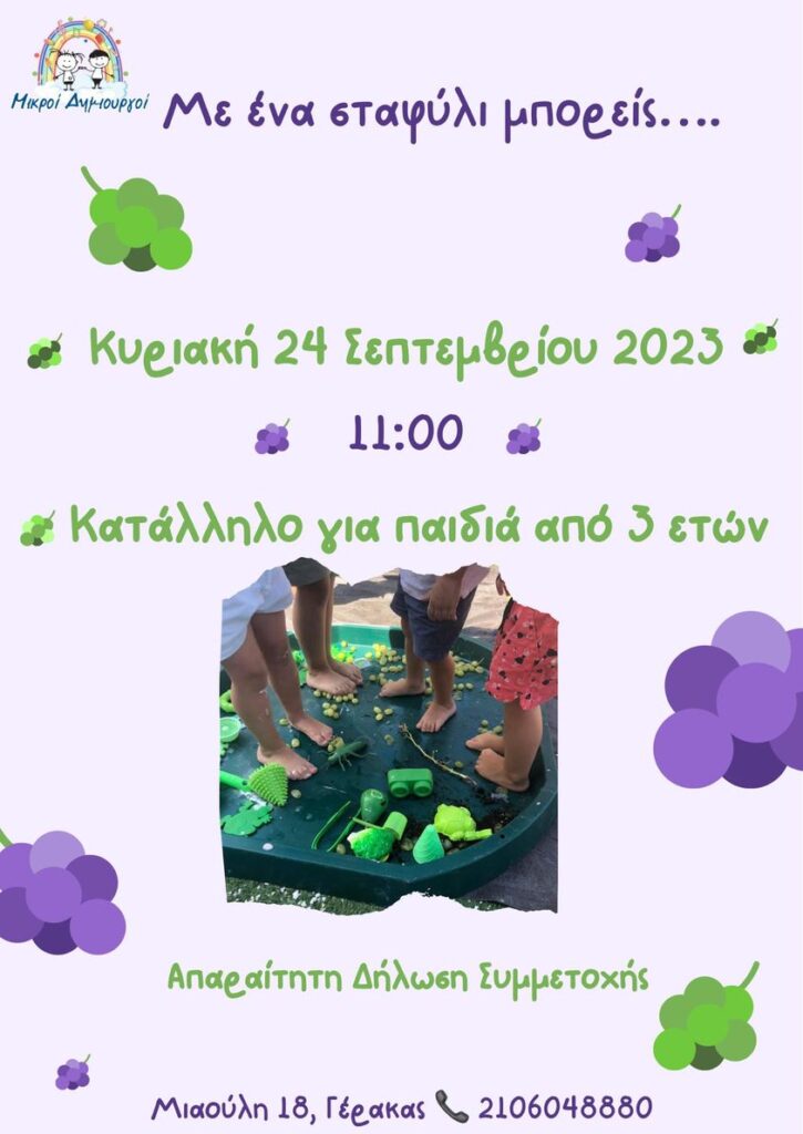 Την Κυριακή στις 11πμ οι Μικροί Δημιουργοί, το Εργαστήρι Παιχνιδιού και Δημιουργικότητας στο Γέρακα, διοργανώνει την Παιδική Εκδήλωση ‘Με ένα σταφύλι μπορείς…’, μια όμορφη εκδήλωση για τον ‘Σεπτέμβριο, τον τρυγητή ή αλλιώς το μήνα του σταφυλιού’.