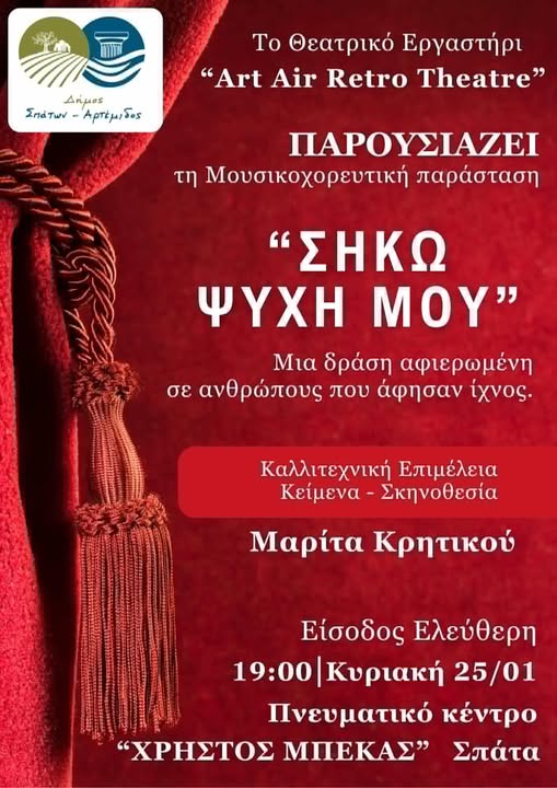 Την Κυριακή το απόγευμα, στις 7μμ, το θεατρικό εργαστήρι Art Air Retro Theatre παρουσιάζει τη Μουσικοχορευτική Παράσταση ‘Σήκω Ψυχή μου’ σε σκηνοθεσία, καλλιτεχνική επιμέλεια και κείμενα Μαρίτας Κρητικού.