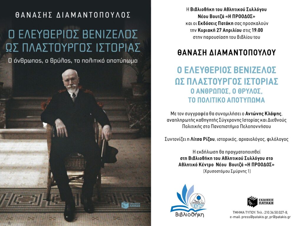 Την Κυριακή το απόγευμα, στις 7μμ, η Βιβλιοθήκη Νέου Βουτζά, διοργανώνει την παρουσίαση του βιβλίου ΄Ο Ελευθέριος Βενιζέλος ως πλαστουργός ιστορίας. Ο άνθρωπος, ο θρύλος, το πολιτικό αποτύπωμα΄ του Θανάση Διαμαντόπουλου.