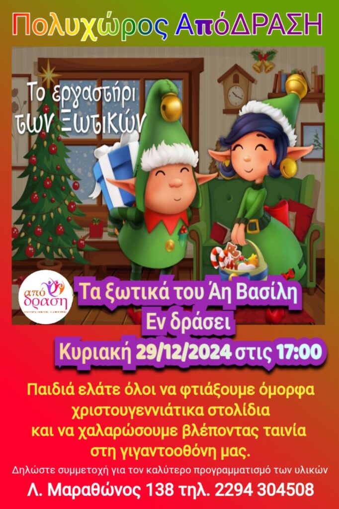 Ο μήνας των Χριστουγεννιάτικων εκδηλώσεων συνεχίζεται στον Πολυχώρο Έκφρασης και Δημιουργίας ΑπόΔΡΑΣΗ και όμορφες δραστηριότητες περιμένουν τα παιδιά, για να διασκεδάσουν και να μπουν στη μαγεία των γιορτών.