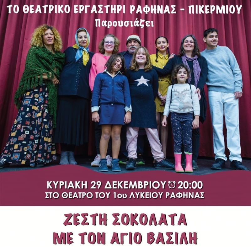 Ο αληθινός Άγιος Βασίλης έρχεται για μία και μοναδική φορά στο αμφιθέατρο του Λυκείου Ραφήνας σε μια πρωτότυπη θεατρική παράσταση για όλη την οικογένεια, για μια ‘Ζεστή Σοκολάτα με τον Άγιο Βασίλη!’, από το θεατρικό Εργαστήρι Ραφήνας Πικερμίου.