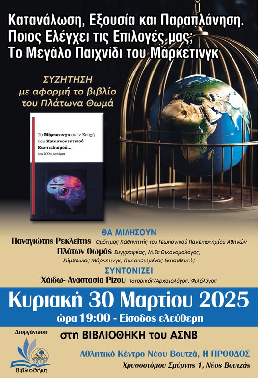 Την Κυριακή το απόγευμα, στις 7μμ, η Βιβλιοθήκη Νέου Βουτζά, με αφορμή το βιβλίο ‘Το Μάρκετινγκ στην εποχή του Κατασκοπευτικού Καπιταλισμού’ του Θωμά Πλάτωνα, διοργανώνει μια συζήτηση για την Κατανάλωση, την Εξουσία και την Παραπλάνηση.