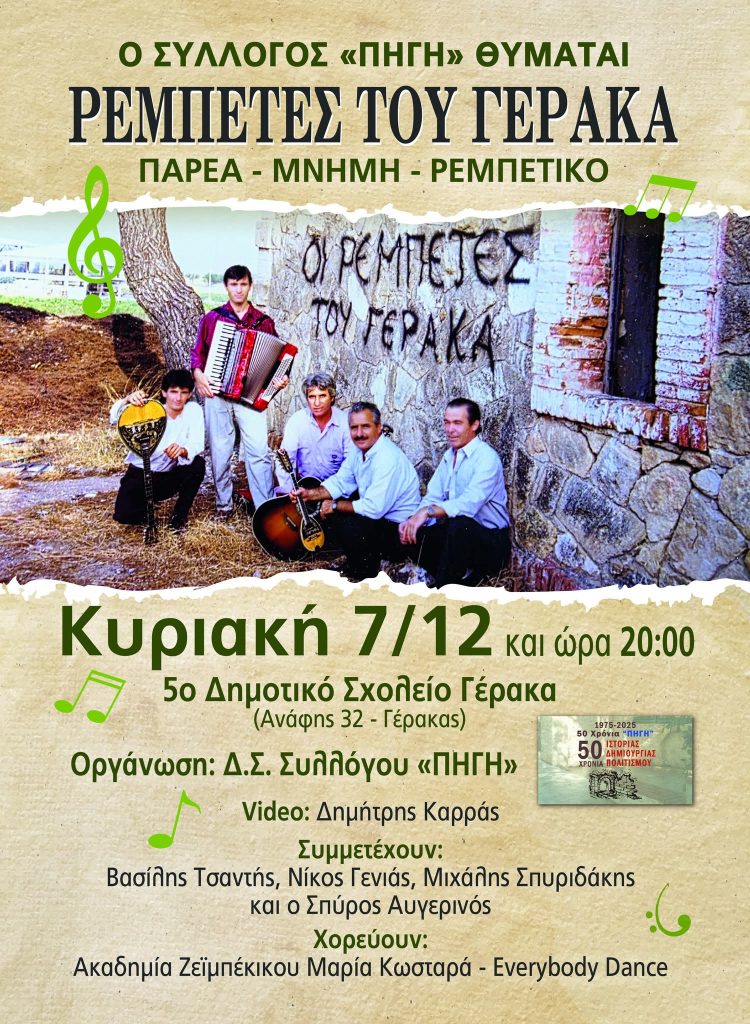Την Κυριακή το βράδυ, στις 8μμ, ο Πολιτιστικός Σύλλογος Γέρακα “Πηγή” παρουσιάζει τους Ρεμπέτες του Γέρακα.