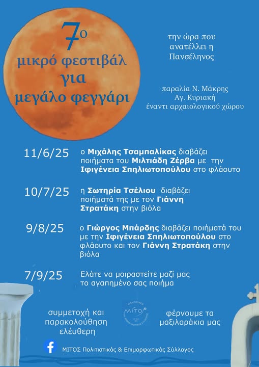 Την Κυριακή το βράδυ, την ώρα που ανατέλλει η πανσέληνος, στις 8.45μμ, ο Πολιτιστικός και Επιμορφωτικός Σύλλογος ΜΙΤΟΣ, στα πλαίσια του 7ου Μικρού Φεστιβάλ για το Μεγάλο Φεγγάρι, διοργανώνει μια Ποιητική Βραδιά με τα δικά σας ποιήματα, στην Παραλία της Νέας Μάκρης.