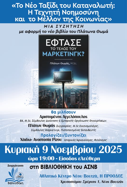 Με αφορμή το βιβλίο θα γίνει μια άκρως ενδιαφέρουσα συζήτηση για το ρόλο της Τεχνητής Νοημοσύνης και του Μάρκετινγκ στη ζωή και το μέλλον μας. Πώς η AI μεταμορφώνει το Μάρκετινγκ, η Τεχνητή Νοημοσύνη και το Μάρκετινγκ είναι τελικά εργαλεία ή απειλή και ο καταναλωτής είναι στόχος ή συμμέτοχος σε όλο αυτό…