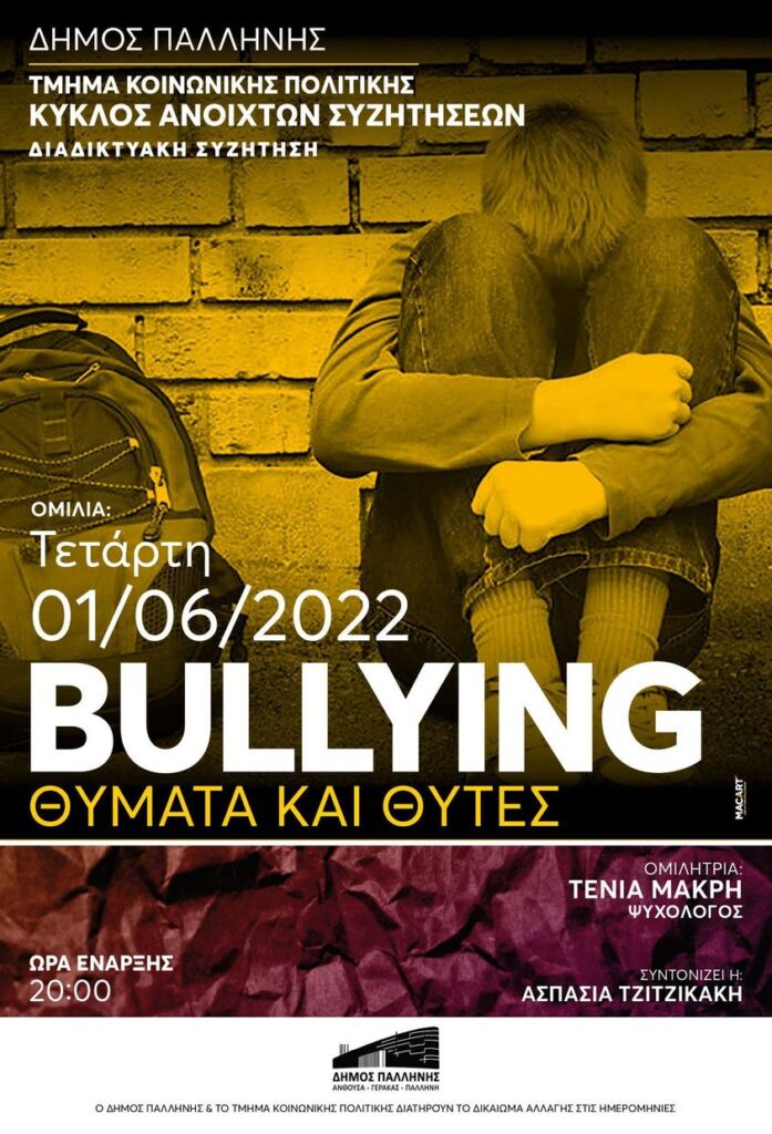 Μιλάμε διαδικτυακά και ανοιχτά για το bullying, ένα από τα μείζονα κοινωνικά προβλήματα, με τη γνωστή ψυχολόγο, Τένια Μακρή, αυτή την Τετάρτη, 1η Ιουνίου, στο πλαίσιο του Κύκλου Ανοιχτών Συζητήσεων για ευαίσθητα, σύγχρονα κοινωνικά ζητήματα, που διοργανώνει το Τμήμα Κοινωνικής Πολιτικής του Δήμου Παλλήνης, υπό τον συντονισμό της Αντιδημάρχου, Ασπασίας Τζιτζικάκη.