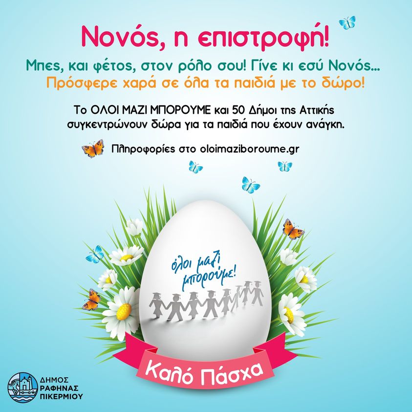 Μια όμορφη κοινωνική δράση αλληλεγγύης διοργανώνεται από το ΟΛΟΙ ΜΑΖΙ ΜΠΟΡΟΥΜΕ και 51 Δήμους της Αττικής, ανάμεσα τους και οι δήμοι Ραφήνας-Πικερμίου, Μαραθώνος, Παλλήνης και Σπάτων-Αρτέμιδος, με σκοπό τη συγκέντρωση Πασχαλινών δώρων, για τα παιδιά οικογενειών που χρειάζονται τη στήριξη μας.