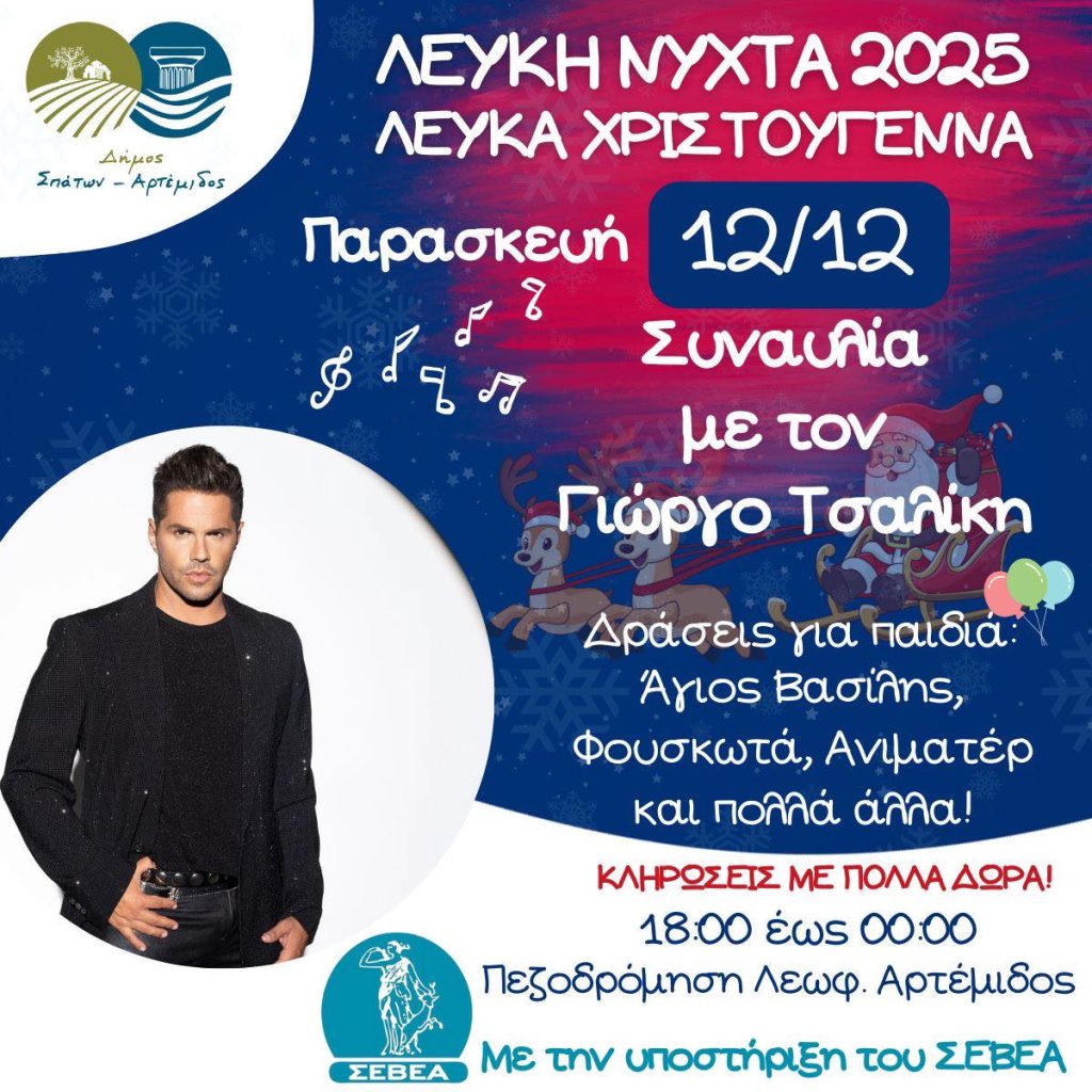 Η εκδήλωση προσφέρει μια μοναδική ευκαιρία στους κατοίκους και επισκέπτες της περιοχής να απολαύσουν τα ψώνια τους, συνδυάζοντας συμφέρουσες αγορές με διασκέδαση, ενώ τα παιδιά θα μπορούν να παίξουν στα φουσκωτά παιχνίδια, να κερδίσουν δώρα και να φωτογραφηθούν με τον Αι Βασίλη και το έλκηθρο του, υπό τις Χριστουγεννιάτικες μελωδίες της Φιλαρμονικής Σπάτων-Αρτέμιδος.