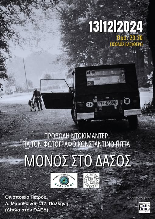 Η Κινηματογραφική Λέσχη Παλλήνης και ο Σύλλογος Εικαστικών Μεσογαίας παρουσιάζουν την Παρασκευή το βράδυ, στις 8.30μμ την προβολή του ντοκιμαντέρ “Μόνος στο Δάσος“, στο Οινοποιείο Πέτρου.