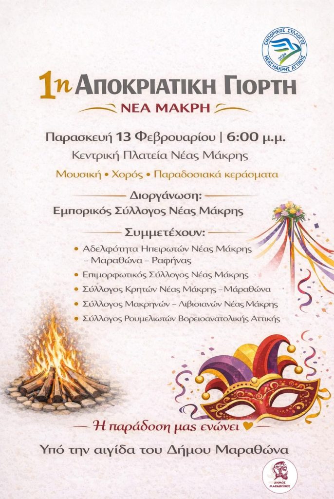 Την Παρασκευή, το απόγευμα, στις 6μμ, οι παραδοσιακοί σύλλογοι Νέας Μάκρης θα αναβιώσουν αποκριάτικα έθιμα με γαϊτανάκι, τραγόμορφους κουδουνοφόρους Διστόμου, Τζαμάλα ή αλλιώς Χέγια, χορούς και παραδοσιακά κεράσματα.