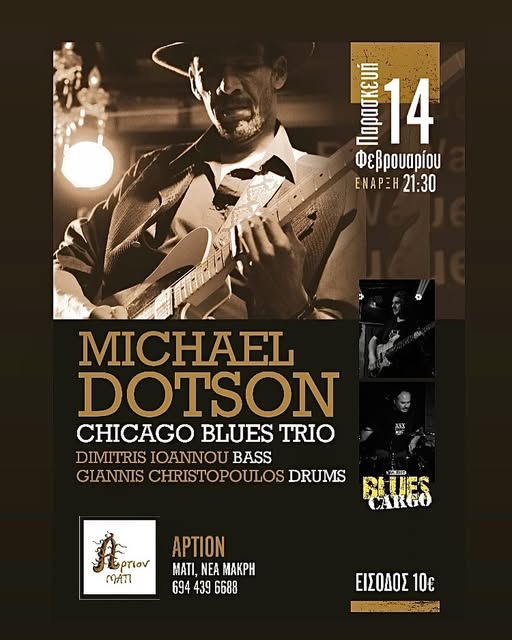 Ο παγκοσμίου φήμης bluesman, κιθαρίστας, συνθέτης και τραγουδιστής από το Σικάγο Michael Dotson σε μια live βραδιά με την καυτή κιθάρα του και διάθεση που θα σας ξεσηκώσει, πλαισιωμένος από τους μουσικούς Δημήτρη Ιωάννου και Γιάννη Χριστόπουλο.