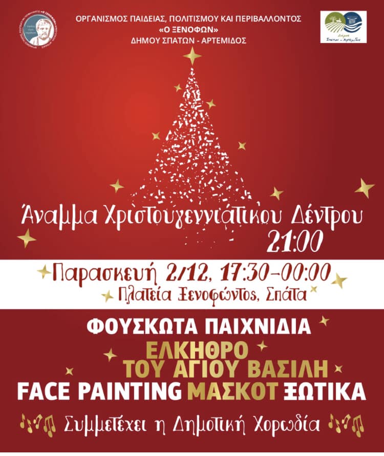 Την Παρασκευή 2 Δεκεμβρίου τα Σπάτα ανάβουν το δέντρο τους και μπαίνουν στο πνεύμα των Χριστουγέννων με μία εκδήλωση που θα ξεκινήσει το απόγευμα στις 5.30μμ και θα διαρκέσει μέχρι τις 12μμ για να προσφέρει χαρά και διασκέδαση σε όλους!