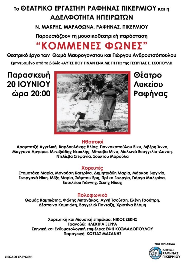 Την Παρασκευή το βράδυ, στις 8μμ, το Θεατρικό Εργαστήρι Ραφήνας – Πικερμίου και η Αδελφότητα Ηπειρωτών Νέας Μάκρης, Μαραθώνα, Ραφήνας και Πικερμίου, παρουσιάζουν τη Μουσικοχορευτική Παράσταση ‘Κομμένες Φωνές’.