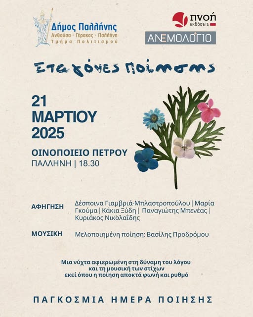Μια ξεχωριστή βραδιά, που θα πραγματοποιηθεί στο Οινοποιείο Πέτρου, στην Παλλήνη, όπου η ποίηση θα αποκτήσει φωνή και ρυθμό, μέσα από την αφήγηση των ποιητών Δέσποινας Γιαμβριά – Μπλαστροπούλου, Μαρίας Γκούμα, Κάκιας Ξύδη, Παναγιώτη Μπενέα και Κυριάκου Νικολαΐδη, ενώ τη μουσική και τα μελοποιημένα ποιήματα υπογράφει και ερμηνεύει ο Βασίλης Προδρόμου.
