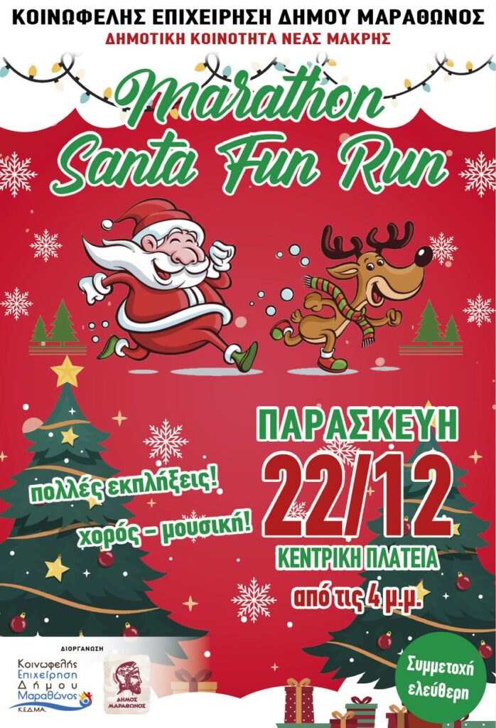 Επίσης για άλλη μια χρονιά θα διεξαχθεί το “Santa Fun Run”, η απολαυστική Χριστουγεννιάτικη κούρσα, που μπορείτε όλοι να πάρετε μέρος και να γίνετε Αι Βασίλιδες, με στολές που θα τις παραλάβετε δωρεάν από τους ανθρώπους του Δήμου και να διασκεδάσετε τρέχοντας στο κέντρο της Νέας Μάκρης, δίνοντας στην πόλη χρώμα και χαρά!