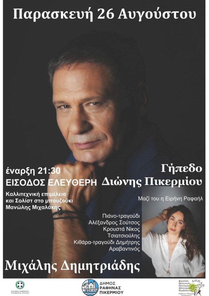 Την Παρασκευή 26 Αυγούστου στις 930μμ ο Δήμος κι ο ΔΟΠΑΠ Ραφήνας-Πικερμίου, σε συνεργασία με την Περιφέρεια Αττικής, σας παρουσιάζουν μια μοναδική συναυλία με τον Μιχάλη Δημητριάδη, στο Γήπεδο Διώνης Πικερμίου με είσοδο ελεύθερη. Ο Μιχάλης Δημητριάδης μαζί με ένα εξαμελές σχήμα σπουδαίων τραγουδιστών και δεξιοτεχνών μουσικών, παρουσιάζουν ένα μοναδικό πρόγραμμα με διαχρονικά και ποιοτικά λαϊκά τραγούδια, σε καλλιτεχνική επιμέλεια του δεξιοτέχνη του μπουζουκιου Μανώλη Μιχαλάκη, ο οποίος εμφανίζεται κι ως σολίστ. Ο Μιχάλης Δημητριάδης θα ερμηνεύσει προσωπικές του επιτυχίες όπως το διαχρονικό «Στων Αγγέλων τα μπουζούκια» που τον καθιέρωσε αλλά κι αγαπημένα τραγούδια μεγάλων συνθετών όπως του Γιάννη Παπαϊωάννου, του Χρήστου Νικολόπουλου, του Άκη Πάνου κ.ά. Μαζί του η τραγουδίστρια Ειρήνη Ραφαήλ.