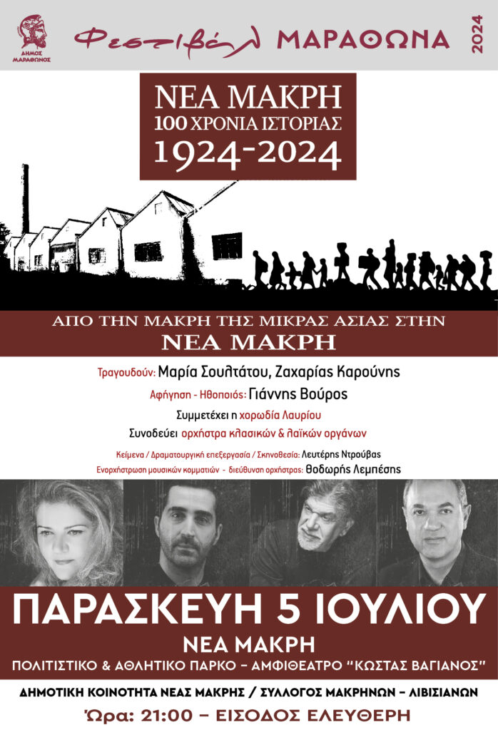 Την Παρασκευή το βράδυ στις 9μμ το Θέατρο Κώστας Βαγιανός, στο Πολιτιστικό και Αθλητικό Πάρκο Νέας Μάκρης παρουσιάζει την Μουσική Παράσταση ‘Νέα Μάκρη 1924-2024 – 100 Χρόνια Ιστορίας’.