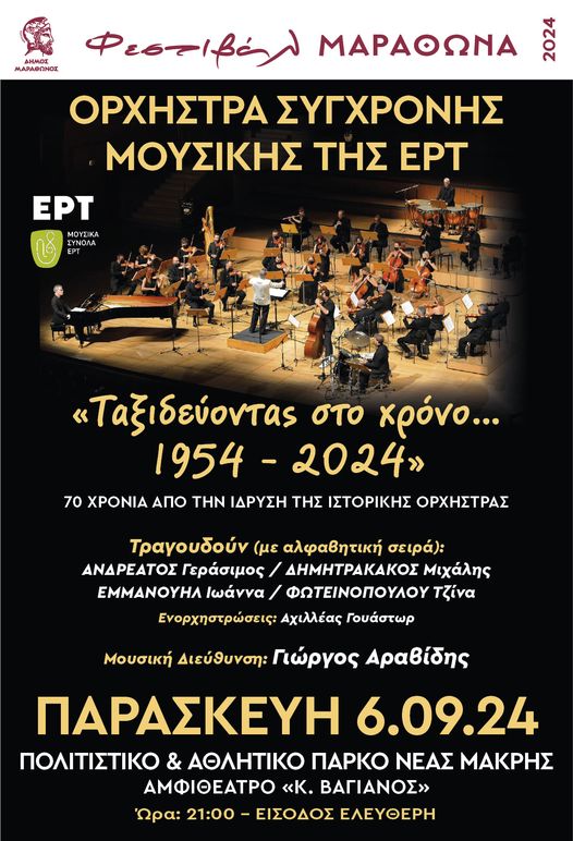 Την Παρασκευή το βράδυ, στις 8μμ, το Πολιτιστικό και Αθλητικό Πάρκο Νέας Μάκρης παρουσιάζει την Ορχήστρα Σύγχρονης Μουσικής της ΕΡΤ στην Μουσική Βραδιά ’Ταξιδεύοντας στο χρόνο… 1954 – 2024’.·