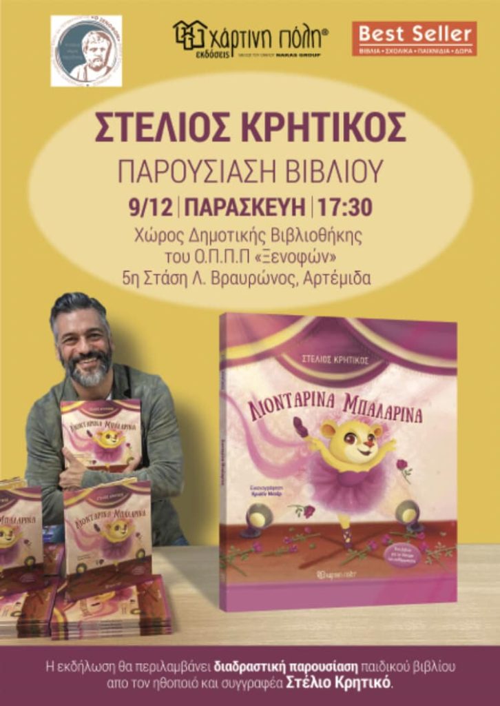 Την Παρασκευή 9 Δεκεμβρίου στις 5.30μμ ο Στέλιος Κρητικός παρουσιάζει το νέο του παιδικό βιβλίο “Λιονταρίνα Μπαλαρίνα” στη Δημοτική Βιβλιοθήκη του Ο.Π.Π.Π “Ξενοφών”, στην Αρτέμιδα.