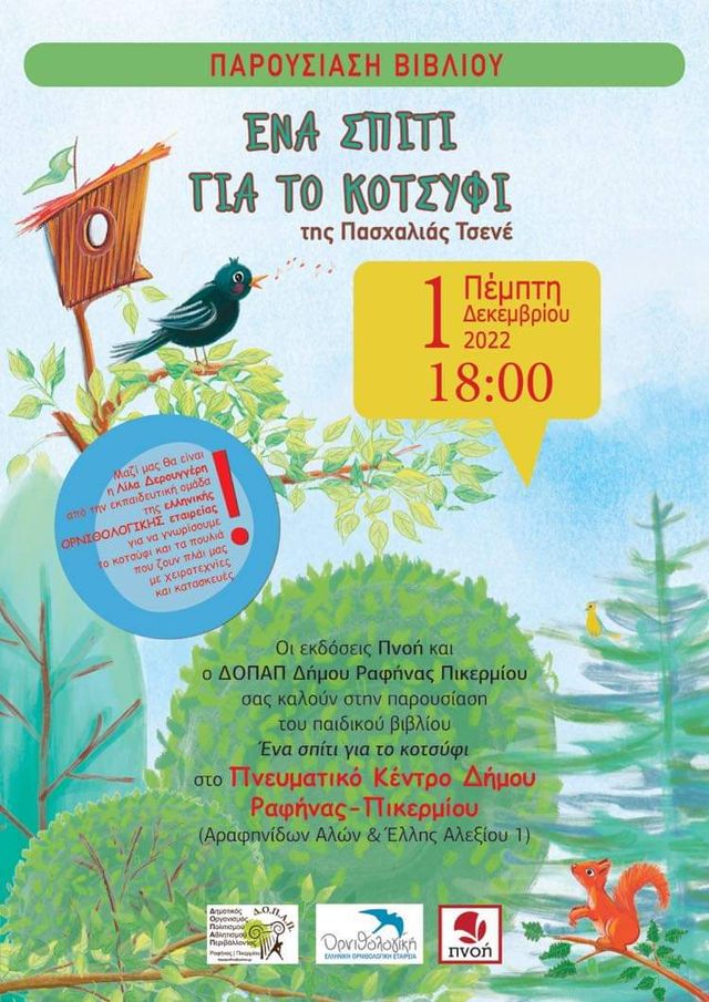 Την Πέμπτη 1 Δεκεμβρίου στις 6μμ ο ΔΟΠΑΠ Ραφήνας-Πικερμίου και οι εκδόσεις Πνοή σας καλούν στην παρουσίαση του παιδικού βιβλίου “ΕΝΑ ΣΠΙΤΙ ΓΙΑ ΤΟ ΚΟΤΣΥΦΙ” της Πασχαλιάς Τσενέ, στην αίθουσα του Πνευματικού Κέντρου του Δήμου Ραφήνας-Πικερμίου.