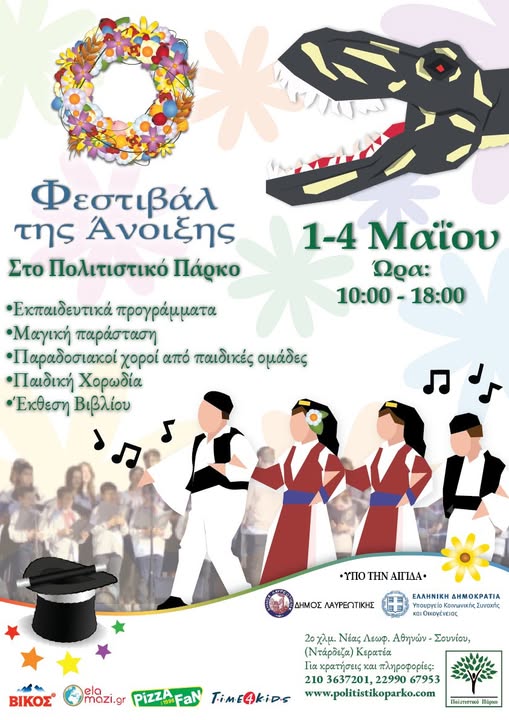 Το Φεστιβάλ της Άνοιξης στο Πολιτιστικό Πάρκο στην Κερατέα υποδέχεται την άνοιξη, από την Πέμπτη 1η έως τη Κυριακή 4 Μαΐου, μεταξύ 10πμ με 6μμ, σε ένα τετραήμερο γεμάτο γνώση, παιχνίδι και φαντασία!