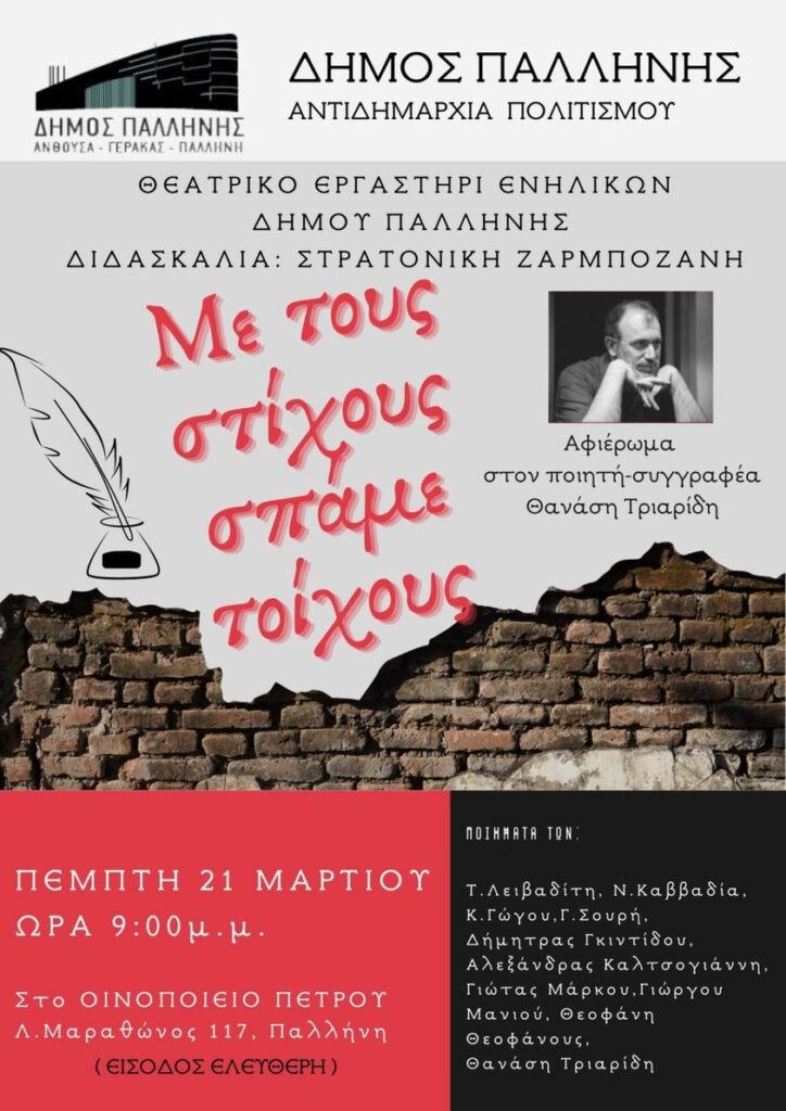 Την Πέμπτη στις 9μμ η ομάδα ενηλίκων του θεατρικού εργαστηρίου του Δήμου Παλλήνης διοργανώνει, στο Οινοποιείο Πέτρου, μια Εκδήλωση – Αφιέρωμα στην Παγκόσμια Ημέρα Ποίησης.