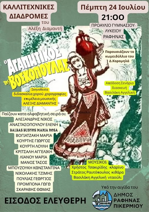 Την Πέμπτη το βράδυ, στις 9μμ, ο Δήμος Ραφήνας – Πικερμίου, στα πλαίσια των καλοκαιρινών πολιτιστικών του εκδηλώσεων παρουσιάζει τη θεατρική ομάδα Βραυρώνας Καλλιτεχνικές Διαδρομές, στη Μουσικοχορευτική Παράσταση ‘Ο Αγαπητικός της Βοσκοπούλας’ του Δημήτριου Κορομηλά, σε σκηνοθεσία Αλέξη Διαμαντή.